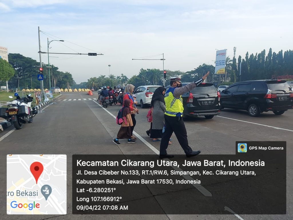 Bekasi – Sebagai wujud kepedulian terhadap keselamatan anak-anak sekolah Anggota Sat Lantas Polres Kab.Bekasi meningkatkan kegiatan pengamanan dan pengaturan jalan dengan membantu anak-anak sekolah menyeberang jalan.