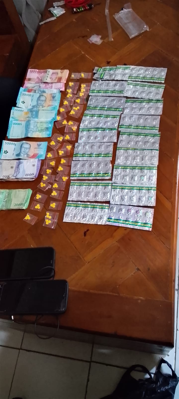 Dari lokasi kedua, petugas menemukan barang bukti berupa 181 butir pil Tramadol, 111 butir pil Eximer, serta uang tunai sebesar Rp. 850 ribu yang diduga hasil penjualan obat-obatan ilegal.