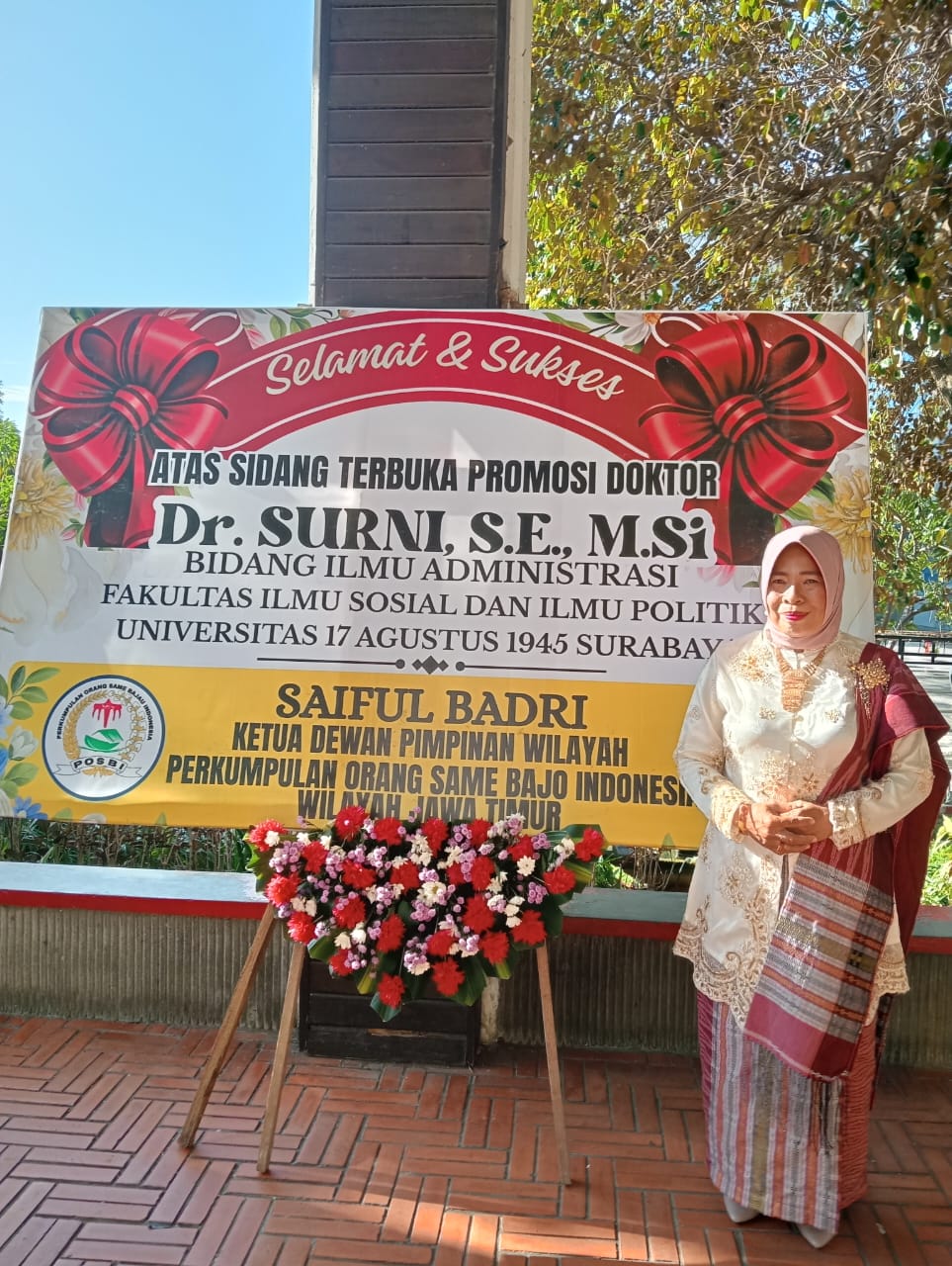 Madura SNP – Pencapaian luar biasa dan membanggakan diraih oleh seorang putri asal Kabupaten Wakatobi, Provinsi Sulawesi Tenggara. Sosok anak nelayan dari suku Bajau/Bajo Sama bernama Dr. Surni, S.E., M.Si. resmi meraih gelar Doktor Ilmu Administrasi setelah menyelesaikan sidang terbuka promosi doktor di Universitas 17 Agustus 1945 Surabaya, Jawa Timur, pada Desember 2025.